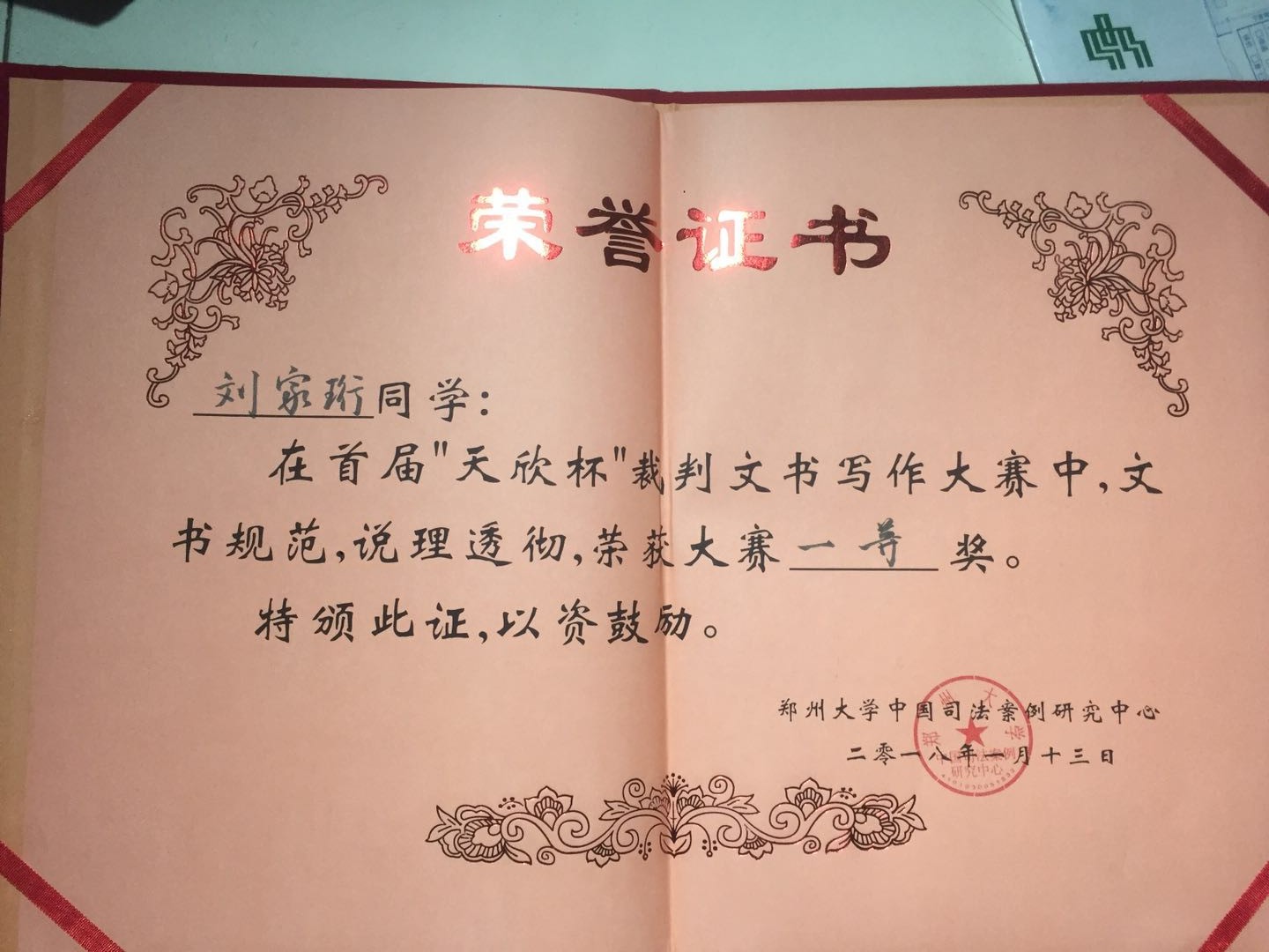 近期获悉,在郑州大学中国司法案例研究中心主办、河南天欣律师事务所协办的首届"天欣杯"裁判文书写作大赛中,我院法学1502班刘家珩荣获大赛一等奖,法学1502班杨淼获得三等奖。